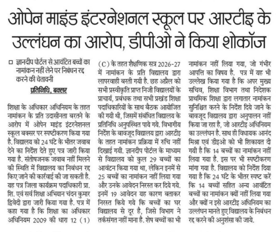 बक्सर जिले में शिक्षा के अधिकार अधिनियम (RTE) के तहत नामांकन में लापरवाही बरतने के आरोप में ओपेन माइंड इंटरनेशनल स्कूल पर कार्रवाई की तलवार लटकने लगी है।