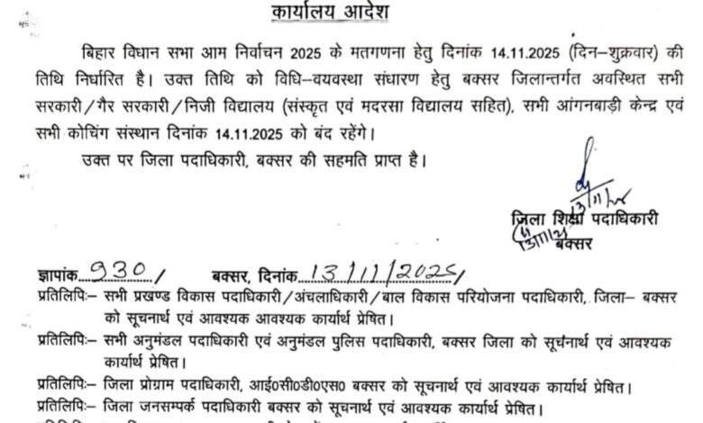 विधानसभा चुनाव की मतगणना को लेकर बक्सर जिले के सभी शैक्षणिक संस्थान रहेंगे बंद